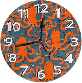 掛時計 壁掛け時計 アナログ クロック インテリア 丸型 サイレント 北欧 オレンジ色 章魚 魚 印刷 掛置兼用 フラットフェイス ホーム ベッドルーム キッチン用 直径25cm 部屋装飾